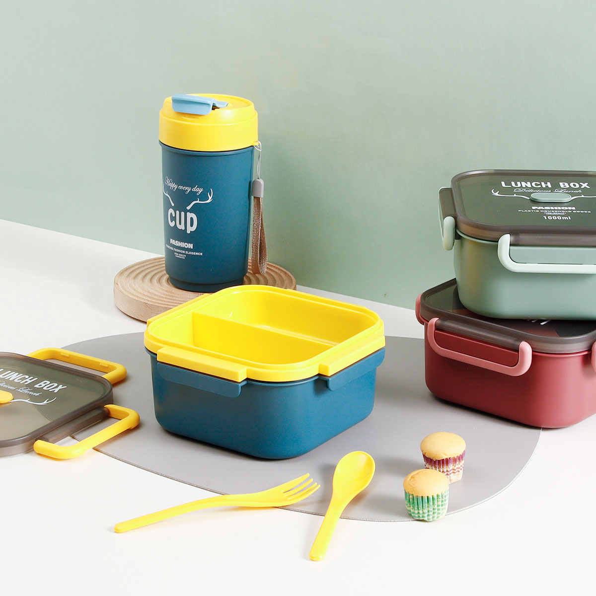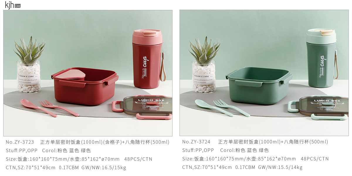 正方雙層/單層密封飯盒+圓形/八角隨行杯