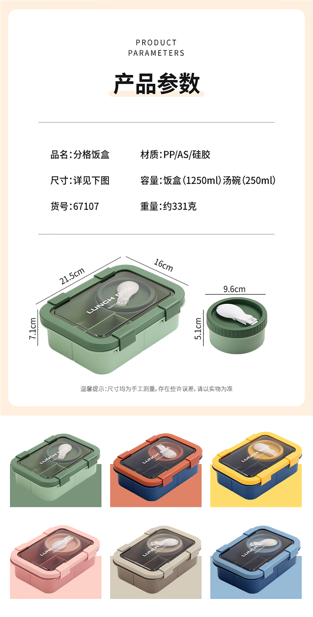 Size: 飯盒:215*160*71mm/1250ml 湯碗:直徑96*高度51mm/250ml
