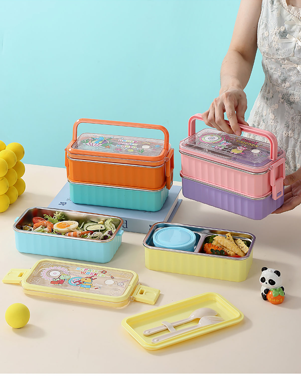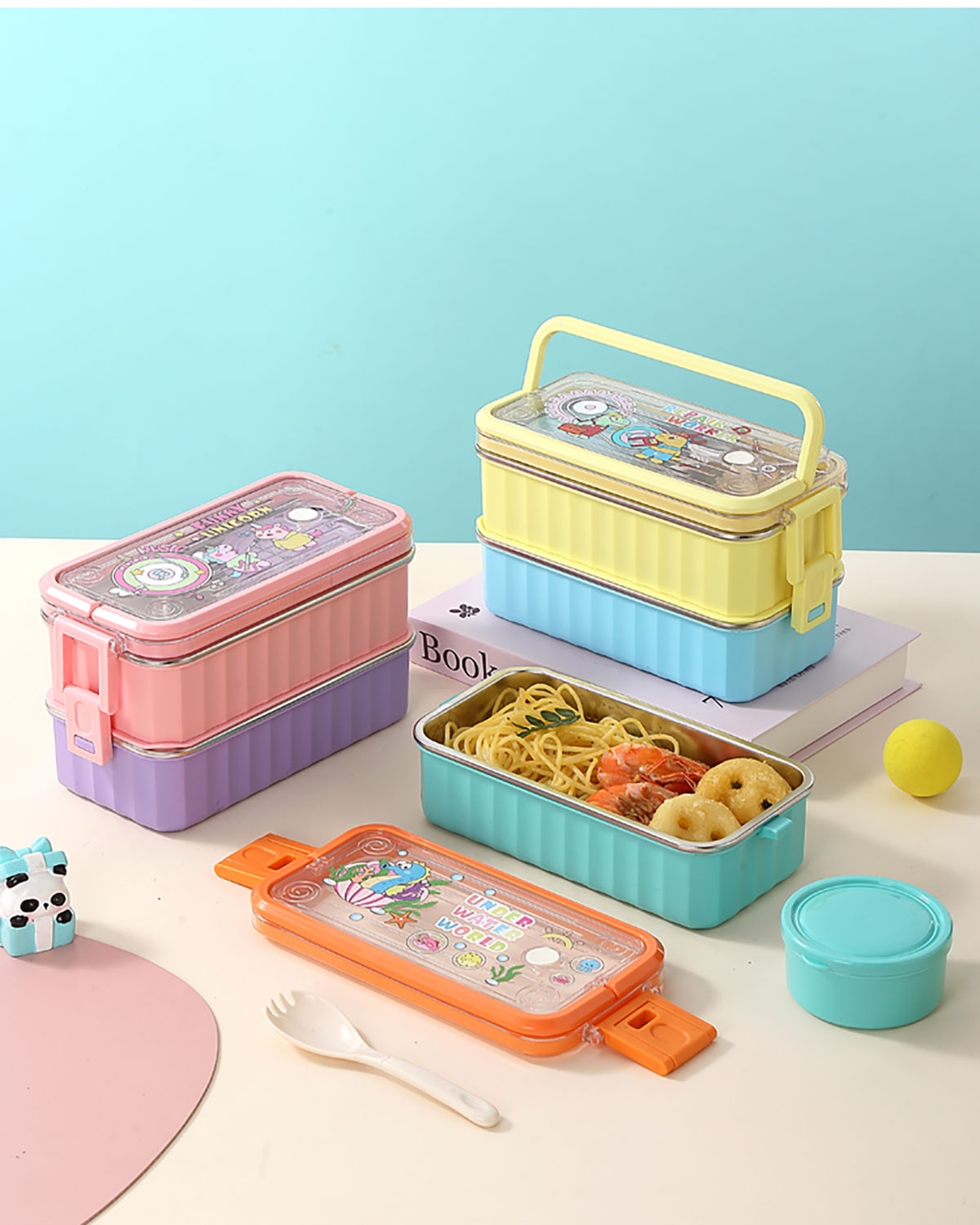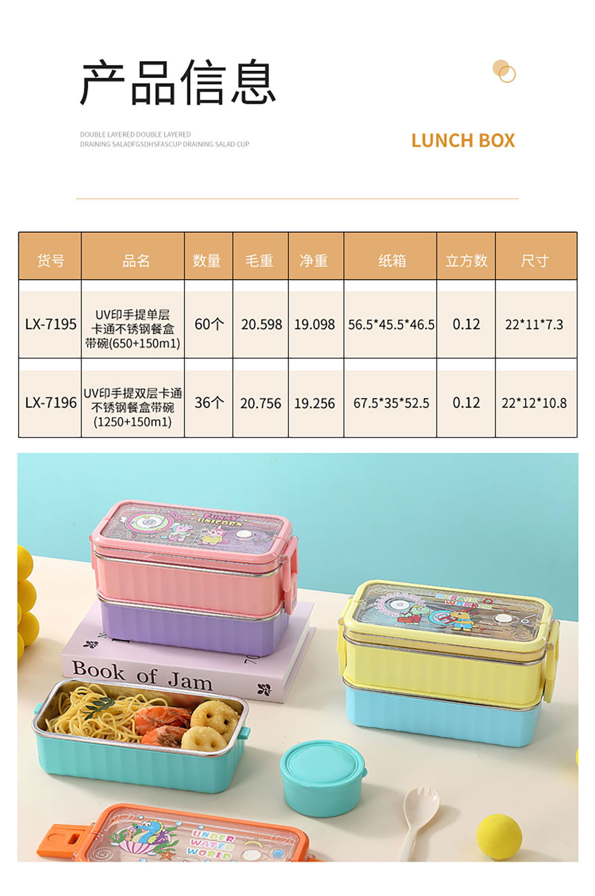 UV 手提單層/雙層卡通不銹鋼餐盒(配PP叉勺+PP湯碗150ml)